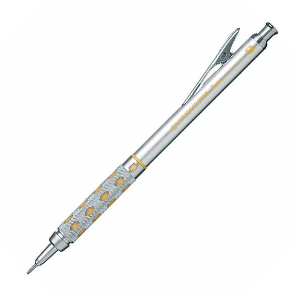 先端部分を収納できる安心設計。グリップ部はゴムグリップとローレット加工を施した新考案のデュアルグリップ採用。クリップは筆記時は先端がボディに半収納される新設計。材質/軸:アルミニウム ノック:ステンレス クリップ:鉄
