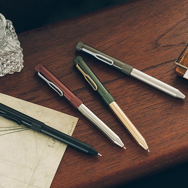 004は2色のゲルインキボールペンとシャープペンシルの多機能ペンです。