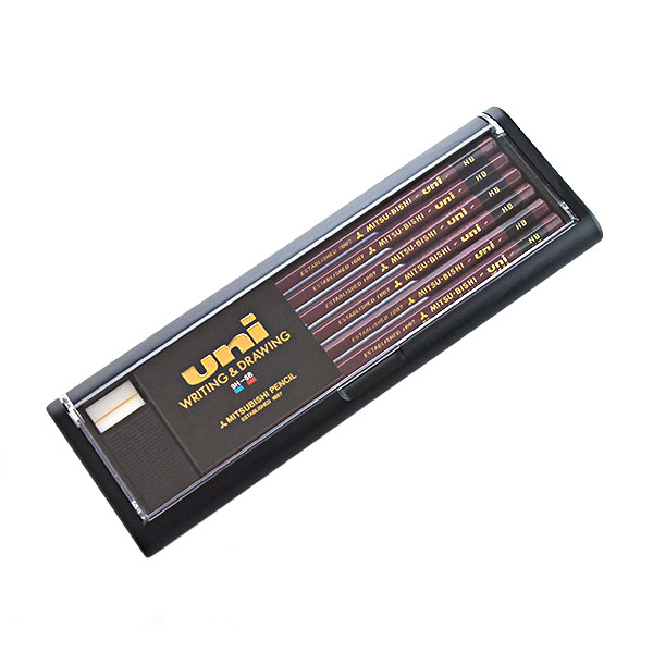 1958年誕生のロングセラー・ユニ、プラスチックケース入り、消しゴム付き。微粒子かつ良質な粘土と黒鉛、粘土を高度な技術で微粒化した 滑らかな書き味のユニ芯を採用。