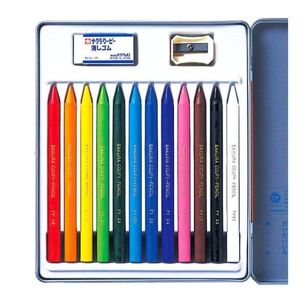 色鉛筆の書き易さと、クレヨンの発色を併せ持った、全部が芯の消せる色鉛筆。バランスの良い配色のメタルケース入り12色セットです。