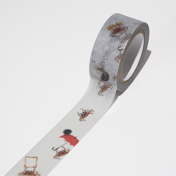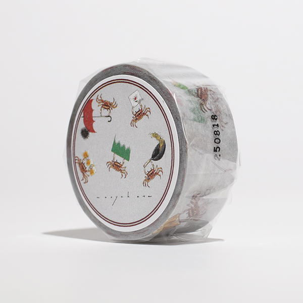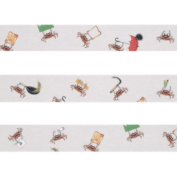 秦直也のイラストの魅力がギュッと詰まったマスキングテープ。めがに、ビールジョッキン、てがに、かにチャーハンなど、洒落のきいたカニが大集合。