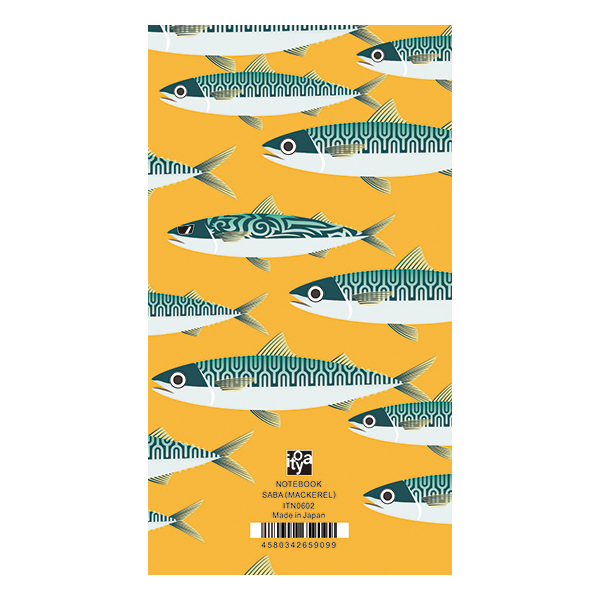 「おいしい魚」たちが海の中を悠々と泳ぐ、色鮮やかな図案に日本の文化を連想させる力強い筆文字があしらわれた、活気とユーモアにあふれたデザインノートです。