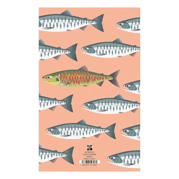 「おいしい魚」たちが海の中を悠々と泳ぐ、色鮮やかな図案に日本の文化を連想させる力強い筆文字があしらわれた、活気とユーモアにあふれたデザインノートです。