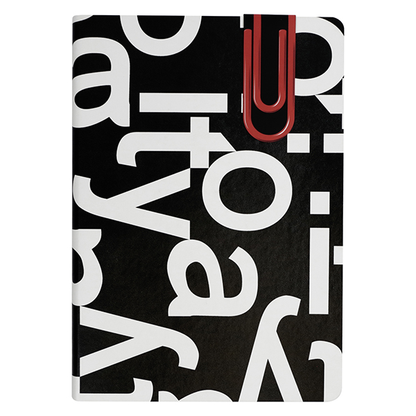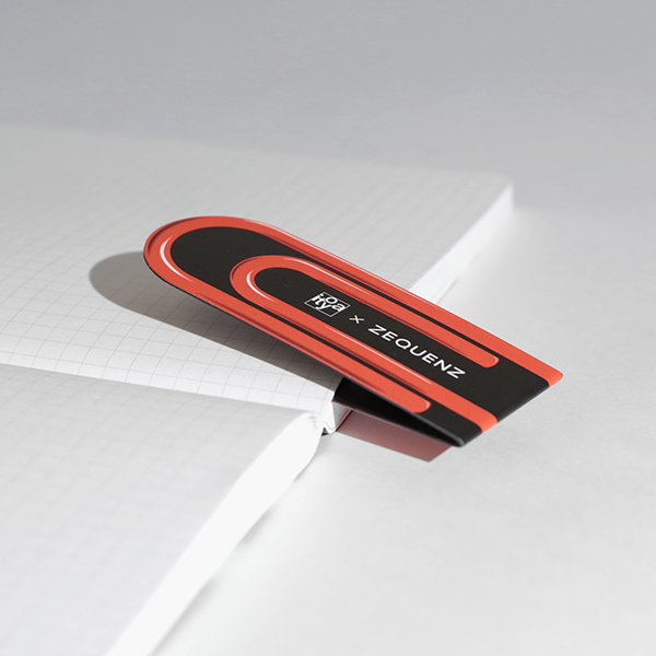 ロゴをレイアウトしています。マグネット製のブックマークは、レッドクリップをモチーフにしたオリジナルデザイン。