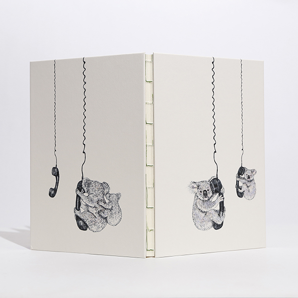 仲良く電話にしがみつくコアラの親子を描いた、若手クリエイターの秦直也とコラボレーションした伊東屋オリジナルノートです。