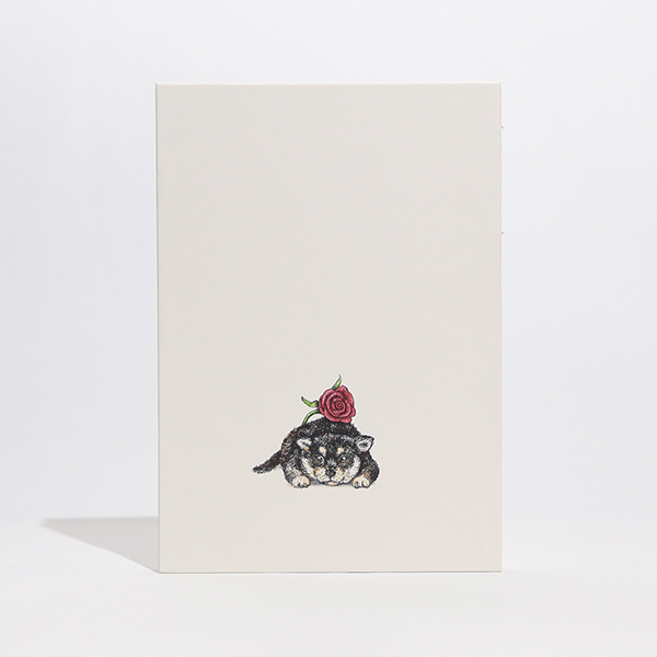 尻尾を器用に使ってバラの香りを楽しむ柴犬を描いた、若手クリエイターの秦直也とコラボレーションした伊東屋オリジナルノートです。