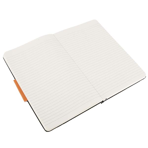 ビジネスノートやダイアリーとして、また、旅先での思い出を綴るのにお使いいただける6mmルールド(横罫)ハードカバー ブラック表紙 ラージサイズの定番ノートブックです。オイルクロスで覆われた硬い表紙、丸みを帯びた角、中性紙、糸綴じ製本、頑丈な表紙を閉じておく為のゴムバンド、使用中のページがひと目でわかるしおり、裏表紙内側にはクロス地で補強された拡張ポケット付きです。240ページ