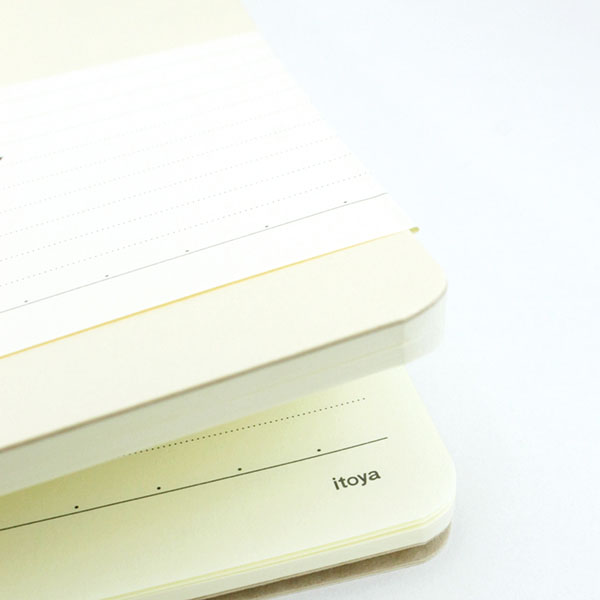 国産高級筆記用紙「OKフールス紙」で作りました。適度な風合いで、万年筆の滑らかな書き味とインクの吸収性に優れています。製本も書きやすいように180°開くように作っています。昔ながらの糸綴じ製本が、品質へのこだわりを感じていただけます。広めの8ミリ罫幅ですので太字の万年筆にもゆったりと書くことができます。「伊東屋オリジナルカバーA5」にお使いいただけます。