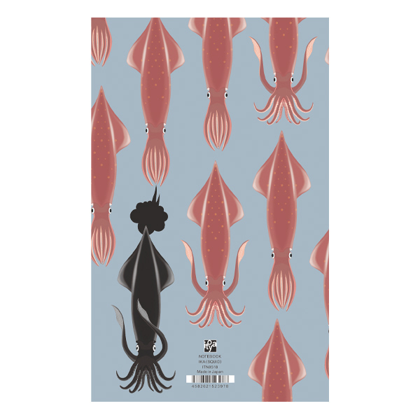 日本の食卓で人気の高いイカ。ブルーグレーの海を、様々なポーズでイキイキと泳ぐ様子を描きました。水玉のような模様、艶やかな身体、つぶらな瞳…さらに目を凝らしてみると、足の内側に細かな吸盤も。眺めれば眺めるほど味の出るグラフィックです。