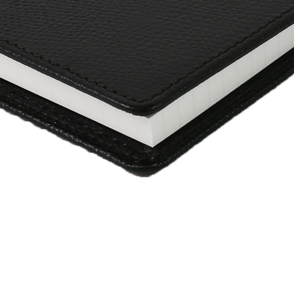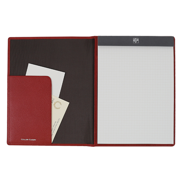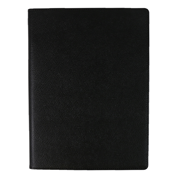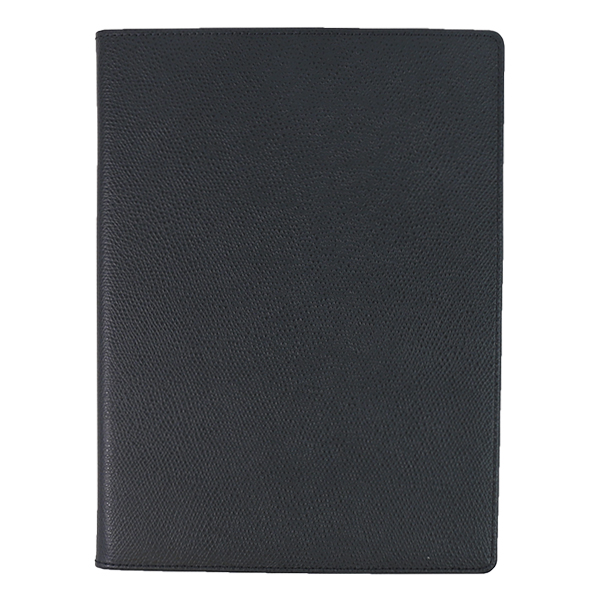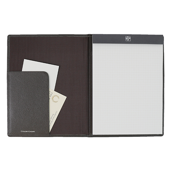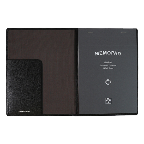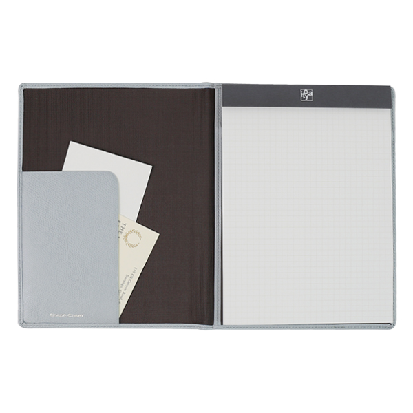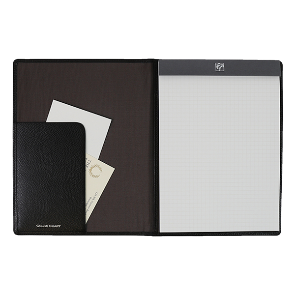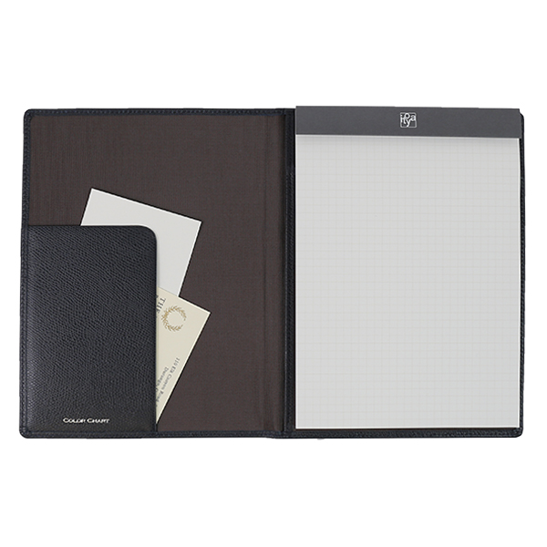 革カバー付きで、かしこまった会議にもふさわしいビジネスツールです。デスクワークにはもちろん、立ったままのメモにも対応する工夫がなされています。