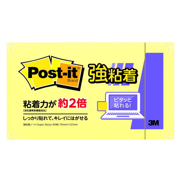 ●強粘着タイプのポスト・イット(R)ノートです。パソコンのデスクトップやキャビネット、樹脂製品などつきにくかった場所にしっかり貼れます。