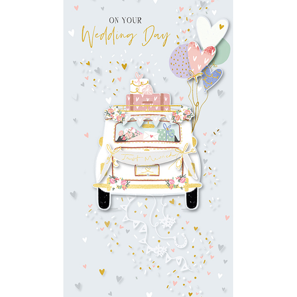 凝った作りの3Dカットマウントのブライダルカーにビジューを添えた可愛らしい結婚祝いカードです。