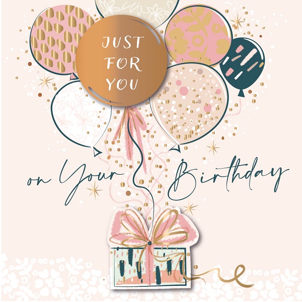 ピンク地にゴールドとカッパ―箔の飛沫が煌めく3Dバースデイカード。