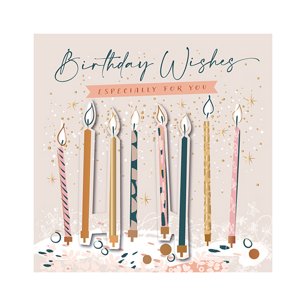 ピンク地にゴールドとカッパ―箔の飛沫が煌めく3Dバースデイカード。