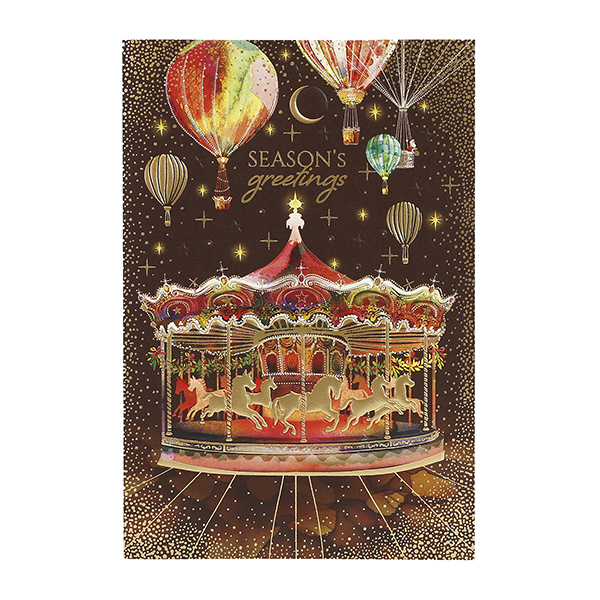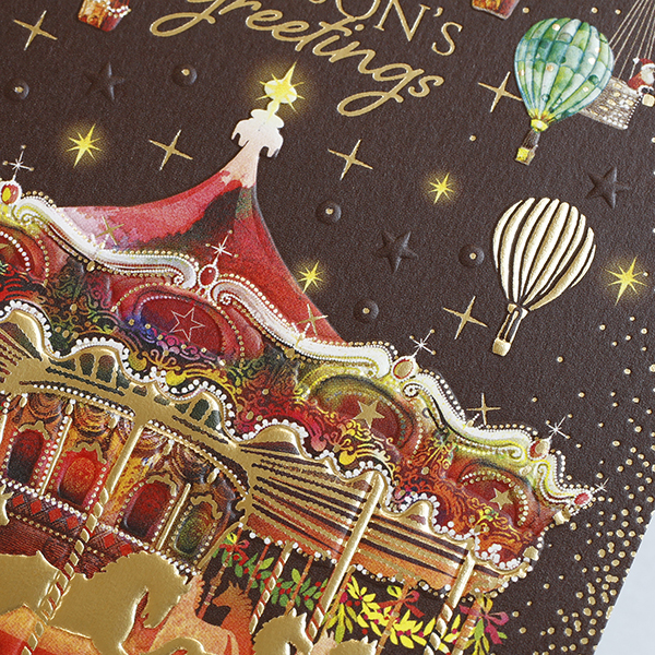 冬の夜にパッと華やぐメリーゴーランドがモチーフのカードです。夜空に浮かぶ気球が幻想的で、まるで夢の中にいるような気分に。