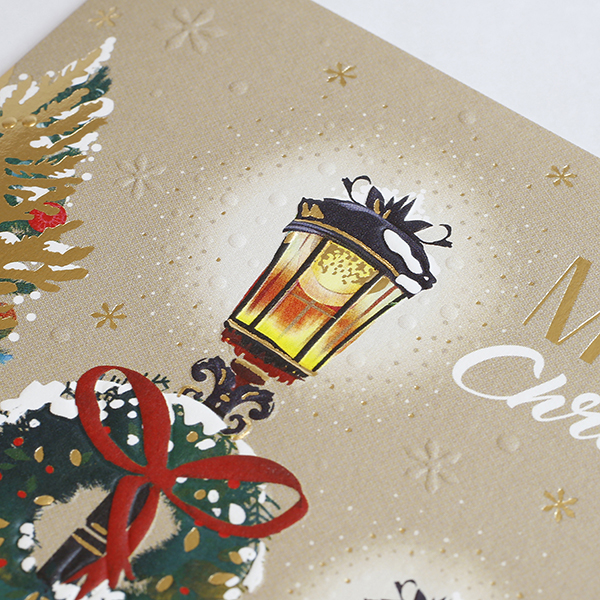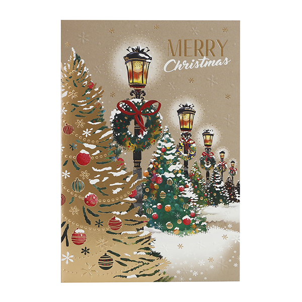 クリスマスの装飾で彩られたツリーと街灯のカードです。クリスマスの訪れに人々のワクワク感が伝わる一枚です。
