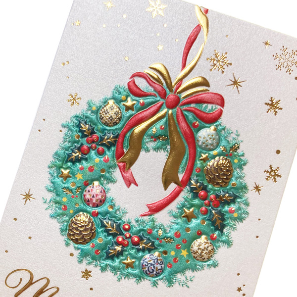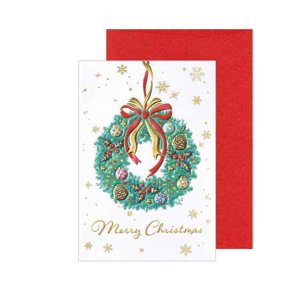 クリスマスリースが中心のベーシックなデザインの洋風クリスマスミニカードです。