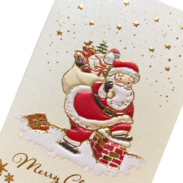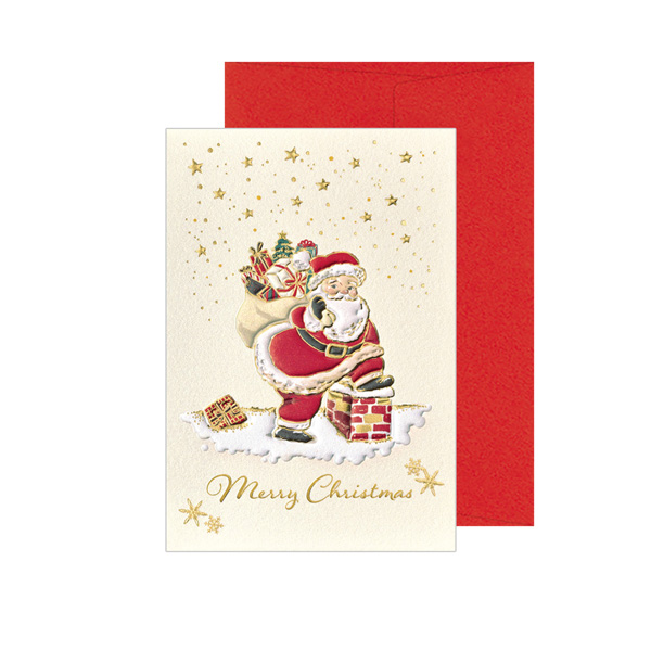 プレゼントを抱え、まさに煙突に入ろうとしているサンタクロースが描かれた洋風クリスマスミニカードです。