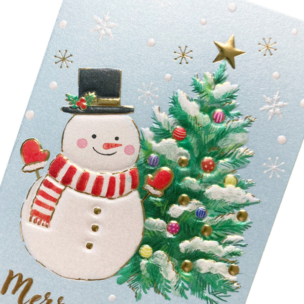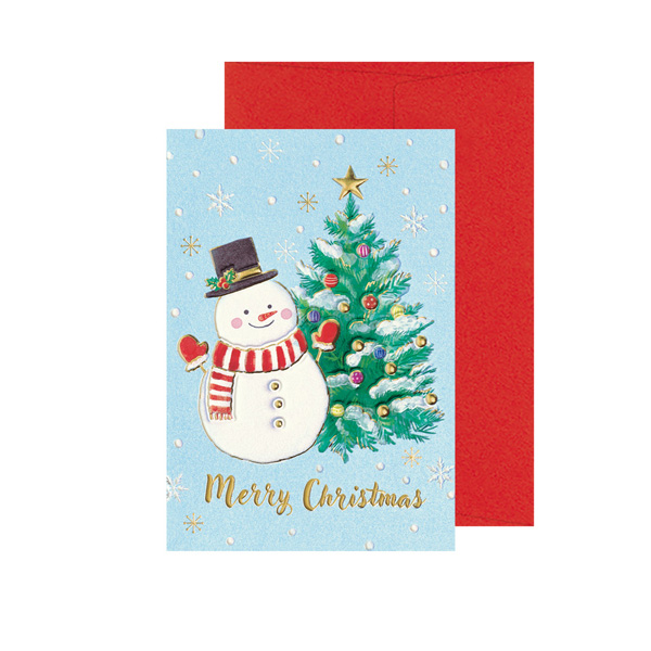 ツリーの隣でにっこり笑ったスノーマンが描かれた洋風クリスマスミニカードです。