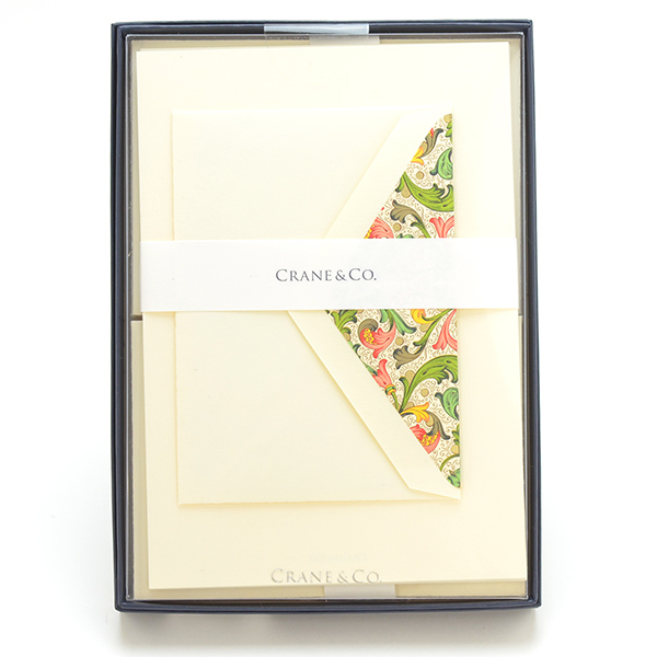 1801年アメリカ・マサチューセッツ州で創業したクレイン社は、ソーシャルステーショナリーの製造を手掛け、宝石店・一流店で販売を開始しました。以来アメリカドル紙幣や、株券、証券、パスポート等にも使用されています。コットン100%、きめ細かく長い繊維の特長を生かした適度な厚みとしなやかさを兼ね備えたクレインペーパーは、エンボス、エングレービング(銅版印刷)、サーモグラフィー(浮出し印刷)を美しく仕上げることができます。また、クレイン社独自のKID FINISHによる表面仕上げにより、手書きの深い味わいを感じさせます。木材パルプを一切使用していない環境に優しいステーショナリーです。