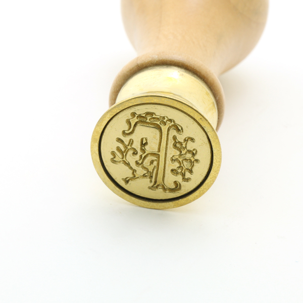 クラシックでエレガントな書体のイニシアルが刻印されたブラス製シールと、落ち着いた赤のワックス1本のセットです。