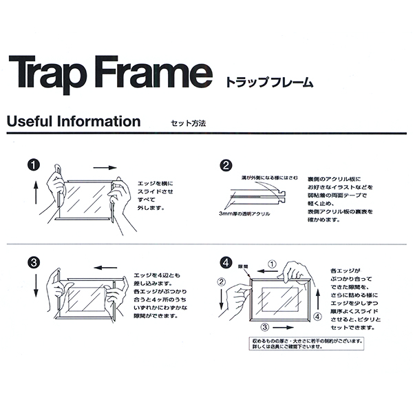良く見かけるアクリルフレームは四隅をビスで止めるタイプですが、トラップフレームはビスを使用しないタイプのフレームです。