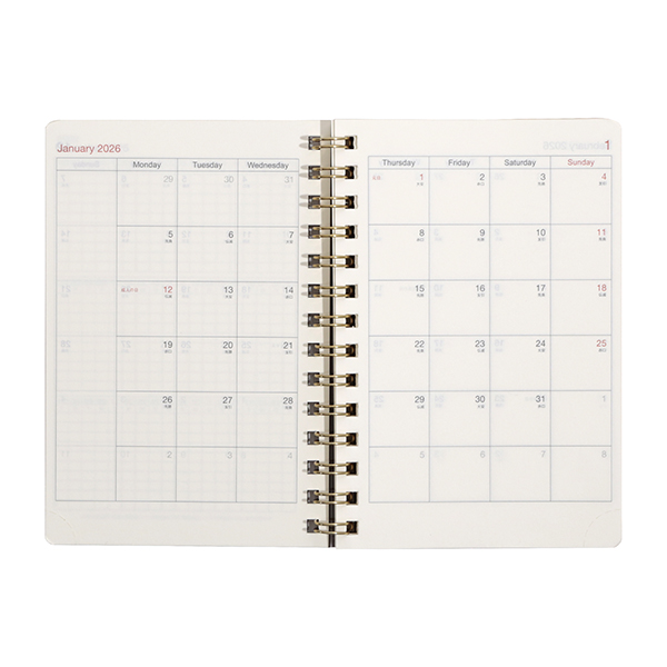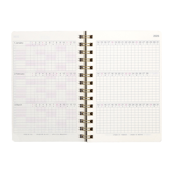 年間カレンダー/年間スケジュール/見開き2週間/ノート/プレゼントメモ/年齢早見表/記念日一覧/贈答のエチケット/手紙のマナー/誕生花と誕生石/度量衡換算表/華氏摂氏温度換算表/紙・封筒・写真サイズ/世界時差表/アドレス帳/PERSONAL REMINDERS