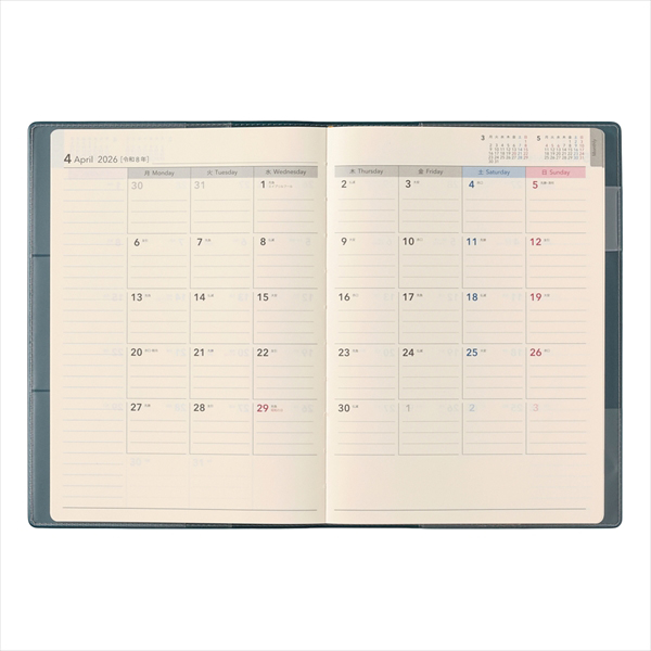 【月間ページ】見開き1ヶ月のベーシックなブロックタイプ(月曜始まり)。カレンダーと同じような感覚で見ることができ、週ごとの予定が把握しやすいのが特徴です。