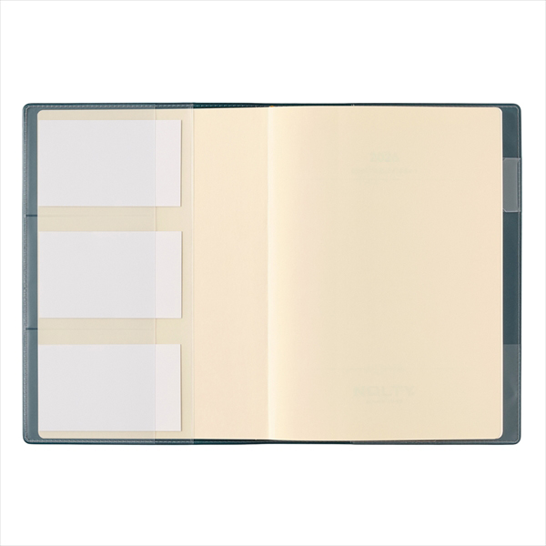 カバー前側には3段名刺ポケット、カバー後ろ側には名刺ポケット・ペンホルダーが付いています。