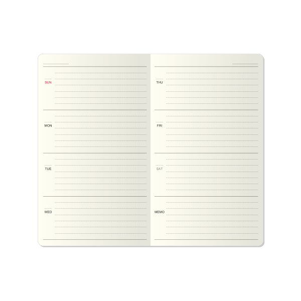 日付を記入して通常のダイアリーとしてお使いいただくほか、1冊を複数のプロジェクト毎に分けて使用したり、家族のスケジュールをページを分けて管理したり、自由にお使いいただけます。