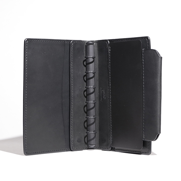 付属のペンホルダーはポケットに差し込むタイプで、万年筆(太さ約16mm径まで)もスムーズに収納可能です。