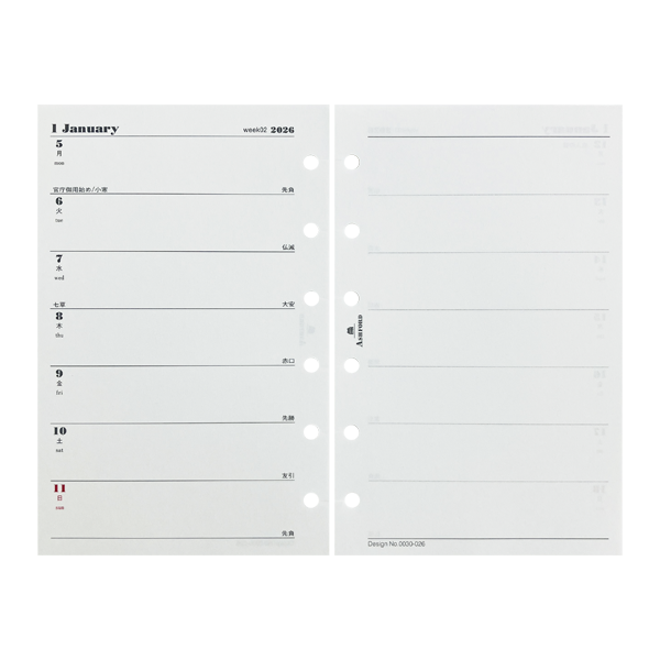アシュフォード26 システム手帳リフィル 週間ダイアリー レフト式 MINI6