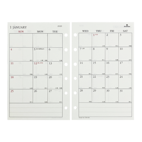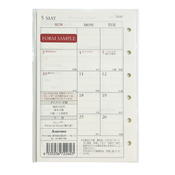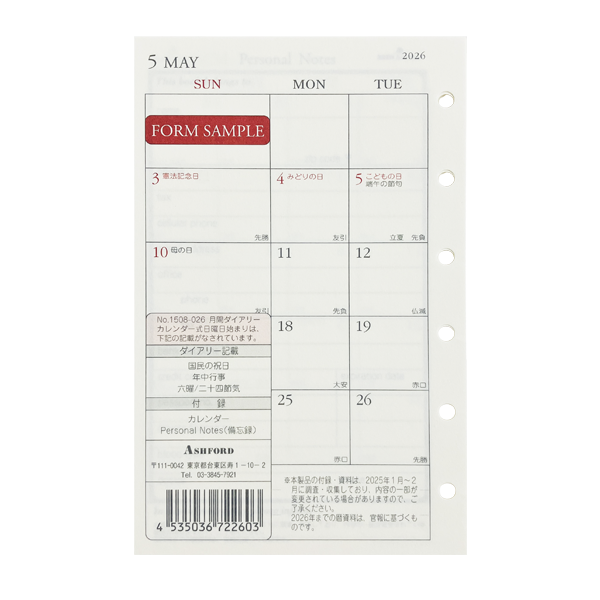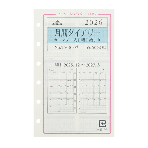 アシュフォード26 システム手帳リフィル 月間ダイアリー カレンダー式日曜日始まり ミニ6 グレース