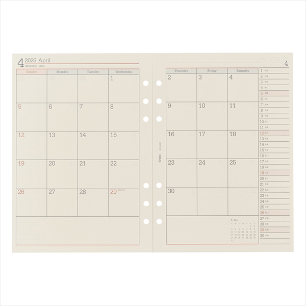 TOP 手帳 システム手帳 26 A5 月間ダイアリー カレンダータイプ ダブルスケジュール型(日曜始まり)