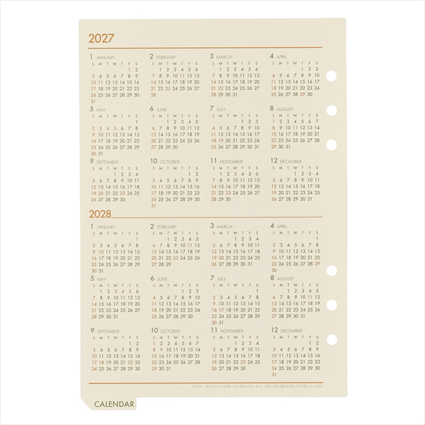 システム手帳用年間カレンダー。切り込み入りで取る・付けるが簡単。