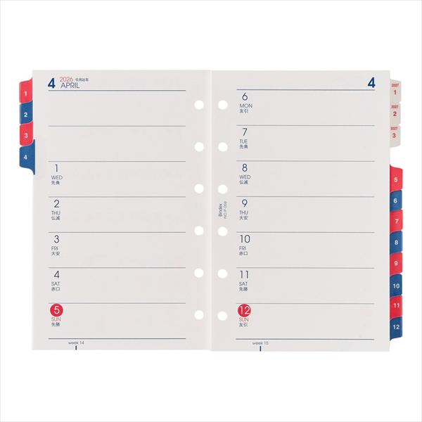 TOP 手帳 システム手帳 26 ミニ6 月間&週間ダイアリー カレンダー+2週間横罫タイプ インデックス付