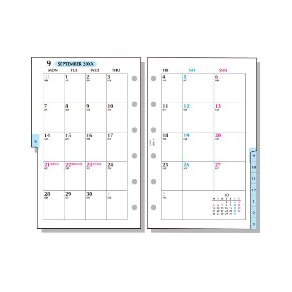 ●月間:見開き両面1ヶ月ブロック式 インデックス付