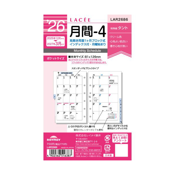 レイメイ26 12月始 月間ブロック インデックス付 LACEE リフィル ポケット 月間4