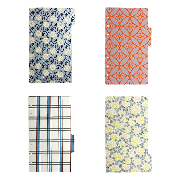 システム手帳を開いた瞬間、まるで宝箱を開けたかのように色鮮やかな柄が目に飛び込み、心が躍ります。伊東屋限定色でミモザ、格子、七宝、小花の4柄を1セットにし、バイブルサイズとミニ6サイズの2種をご用意。日々のページをめくるたびに新鮮な喜びを感じられます。