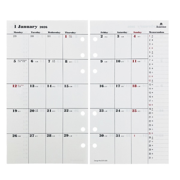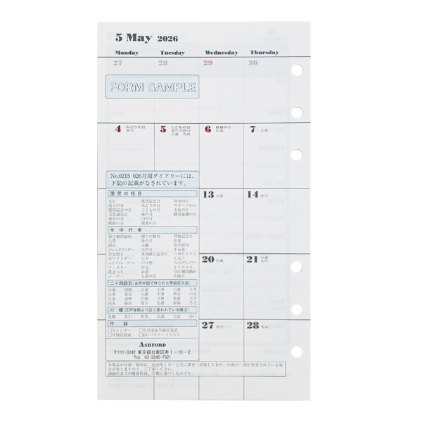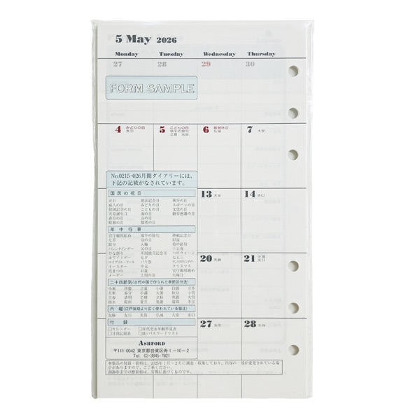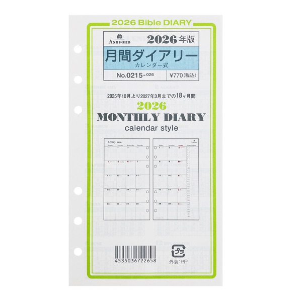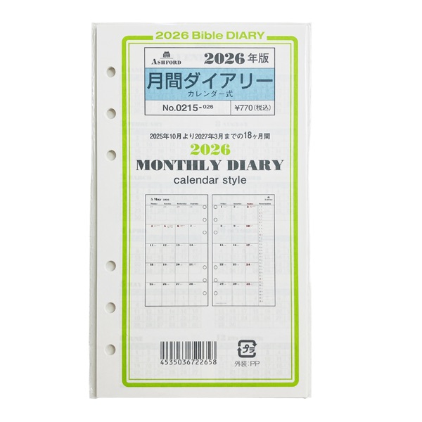 アシュフォード26 システム手帳リフィル 月間ダイアリー カレンダー式 BIBLE