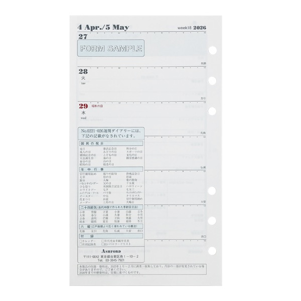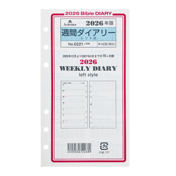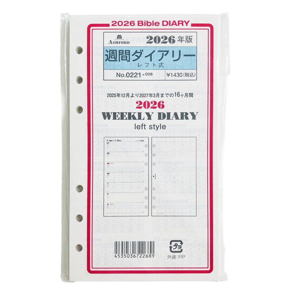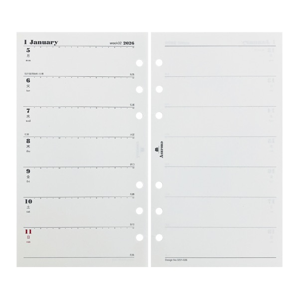 左ページに1週間分のダイアリー、右ページは日付ごとに区切られたフリースペースのメモ欄としてご使用いただけます。