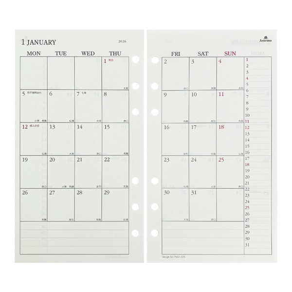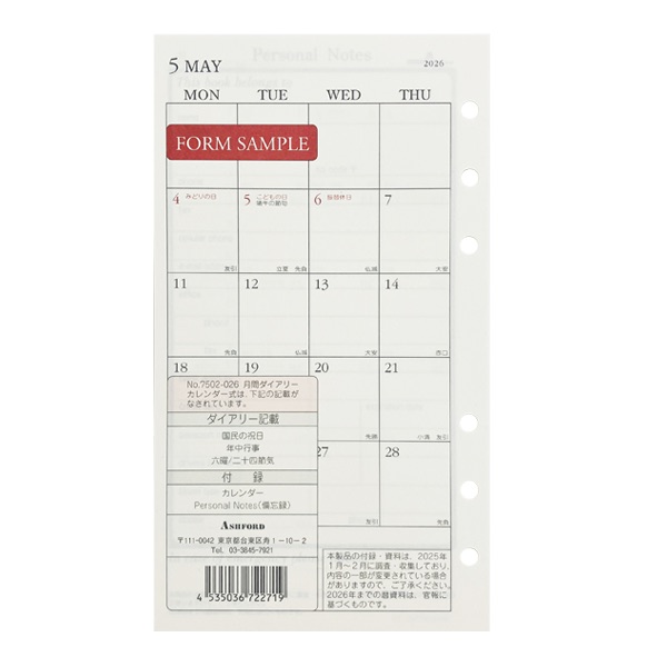 アシュフォード26 システム手帳リフィル 月間ダイアリー カレンダー式 BIBLE<グレース>