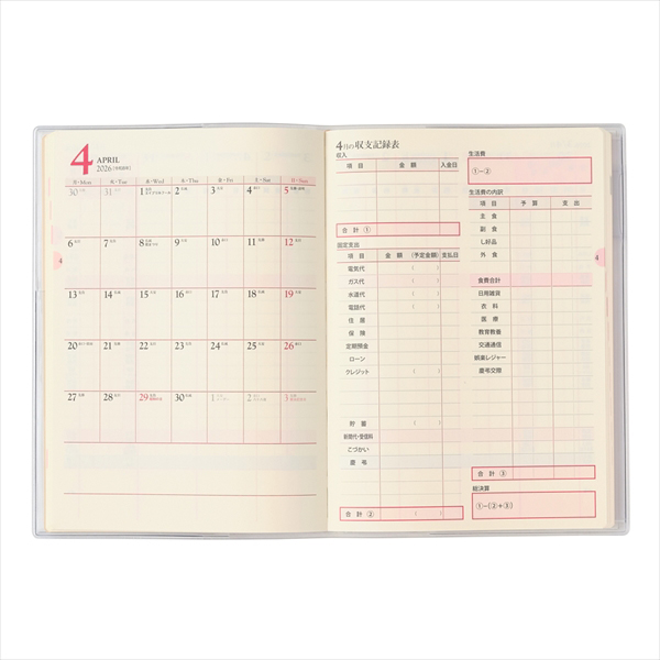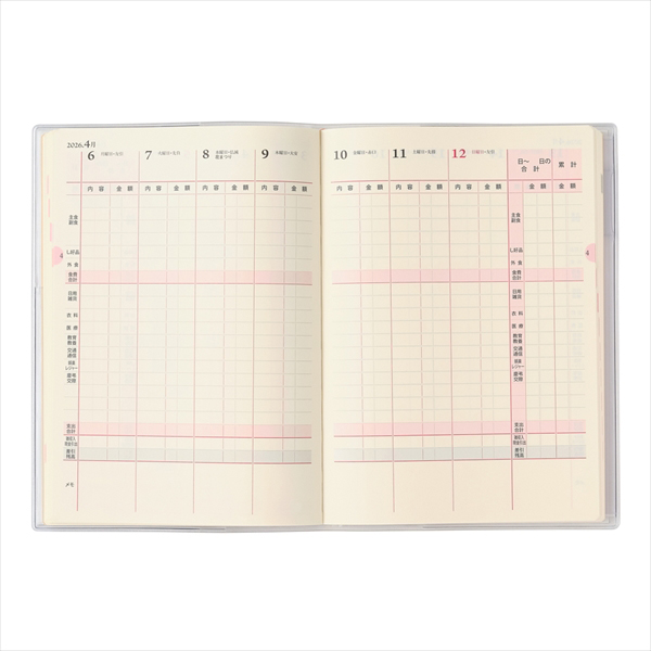 【レイアウト】「食費」などの費目ごとに管理するベーシックな週計タイプ。「年間収支記録表」「医療費の控え」など便利な巻末資料や、レシートなどの保存に便利なしおりポケット付きです。