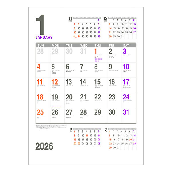 当月と前後2ヶ月が1枚でご覧いただけます。