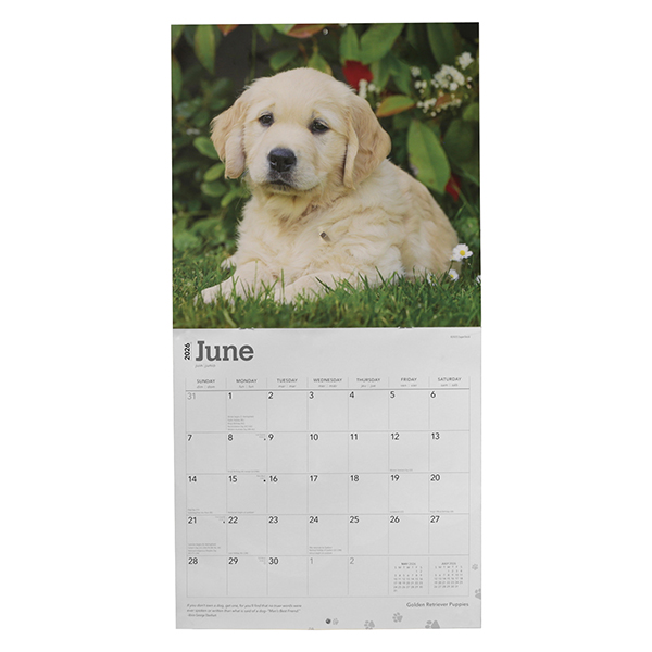 このカレンダーには、ゴールデンレトリバーの子犬の素敵な写真が12ヶ月収録されています。