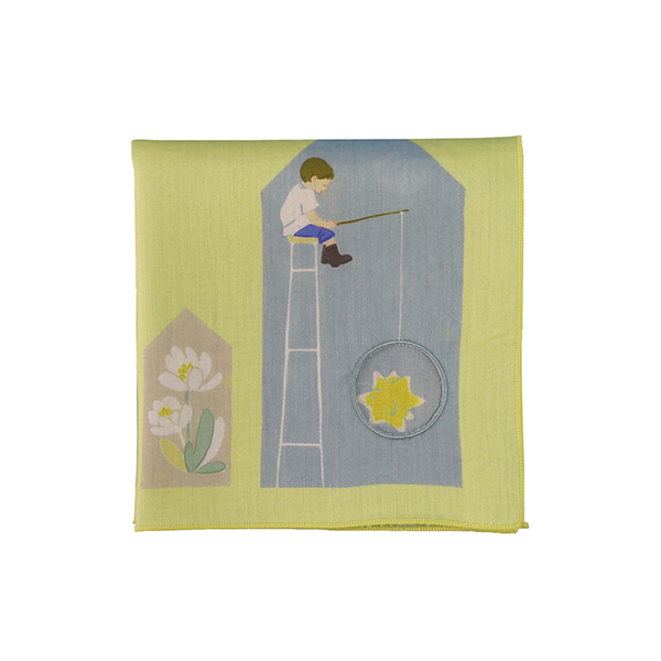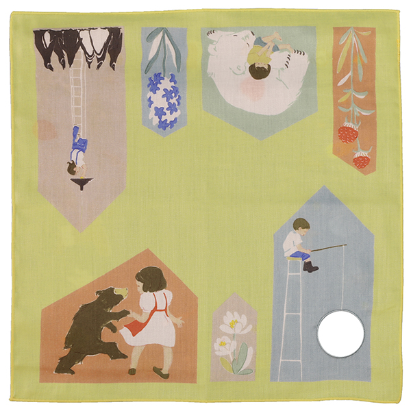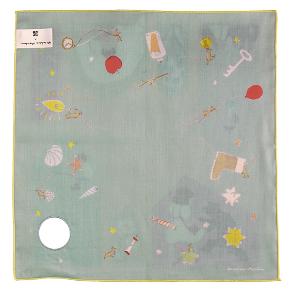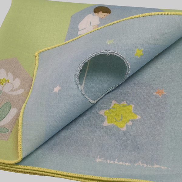 北原明日香のイラストを両面に施したリバーシブル仕様の穴あきハンカチ。