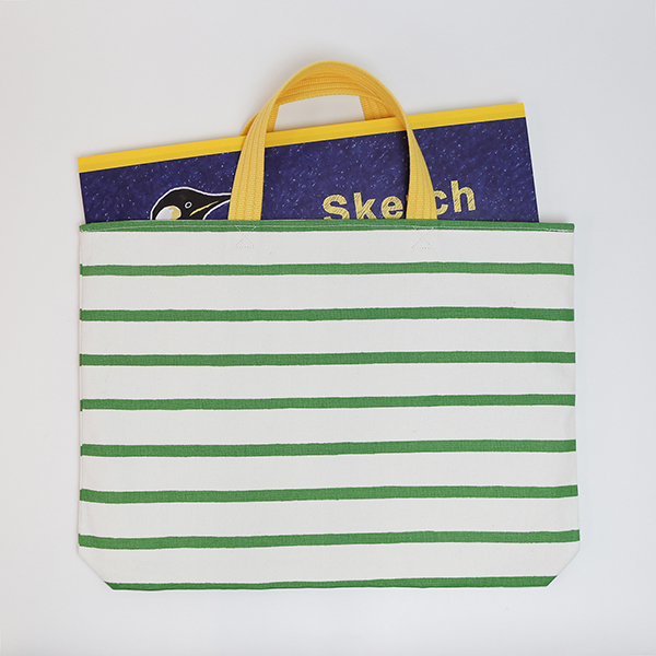 横型のレッスンバッグは、A4が余裕をもって入るサイズ。マチがあるので、厚みのある本も入ります。図画工作の時間に使うスケッチブックや色鉛筆、図書館で借りた図鑑、習いごとの音楽教室へ持っていく楽譜…いろいろな用途で使えます。ライナーは汚れがつきにくい撥水性のある生地を使用、内側にはネームタグ付き。