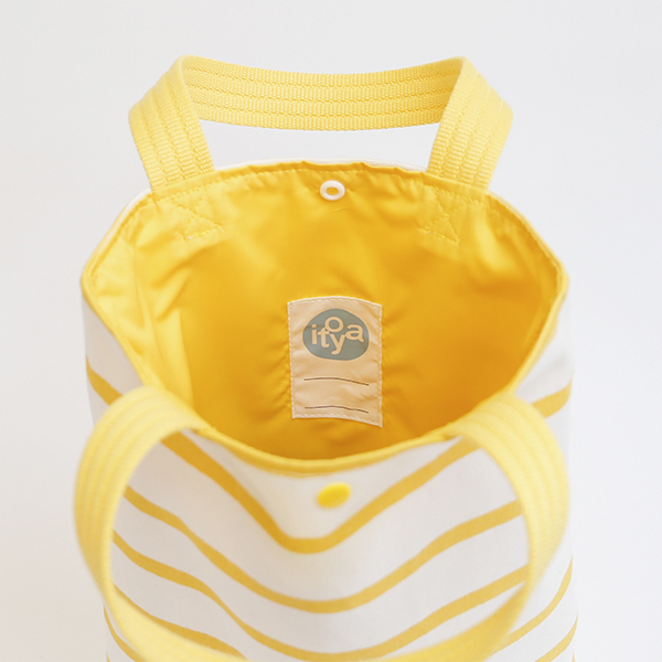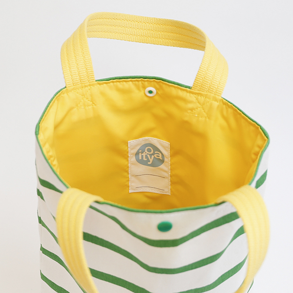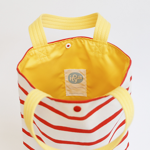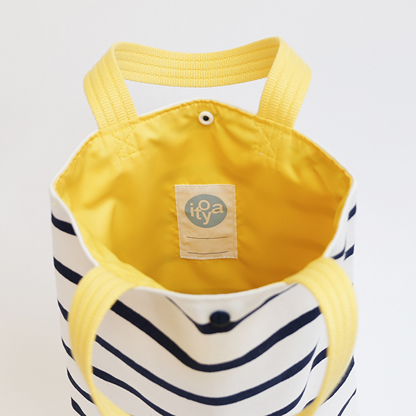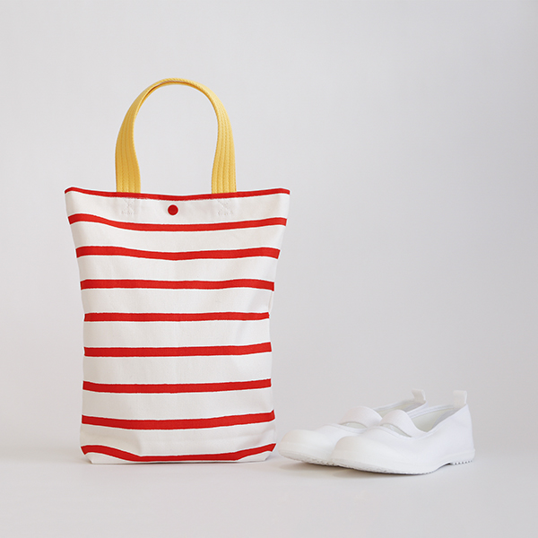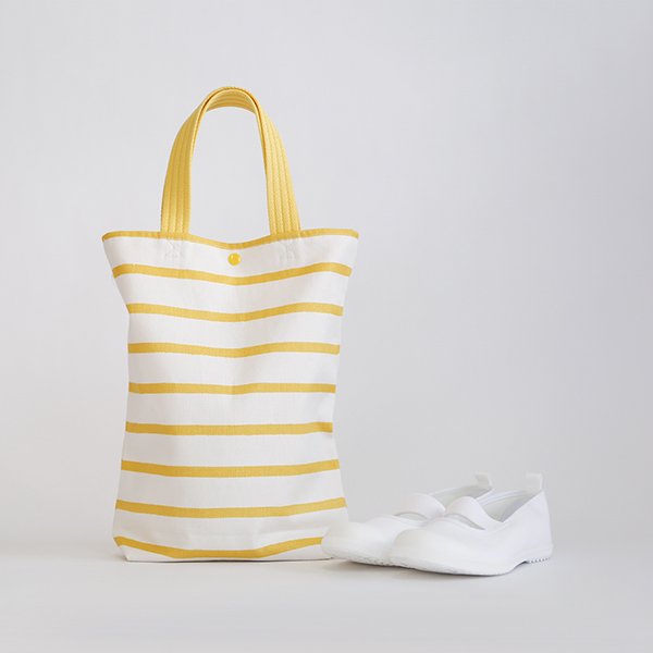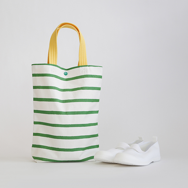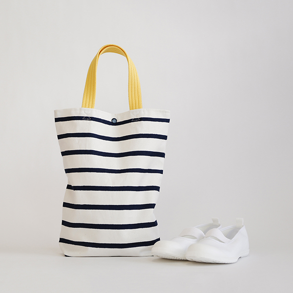 上履きや運動靴を入れて運ぶシューズバッグは、スナップボタンをつけ、ハンドルを2つにしたのもポイントです。靴を入れて運ぶときもバッグとしてきれいな形で運べるようになりました。小さなトートバッグのような形状だから、靴を運ぶ以外の用途にも活用できます。ライナーは汚れがつきにくい撥水性のある生地を使用、内側にはネームタグ付き。
