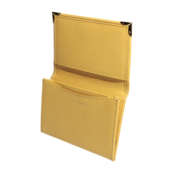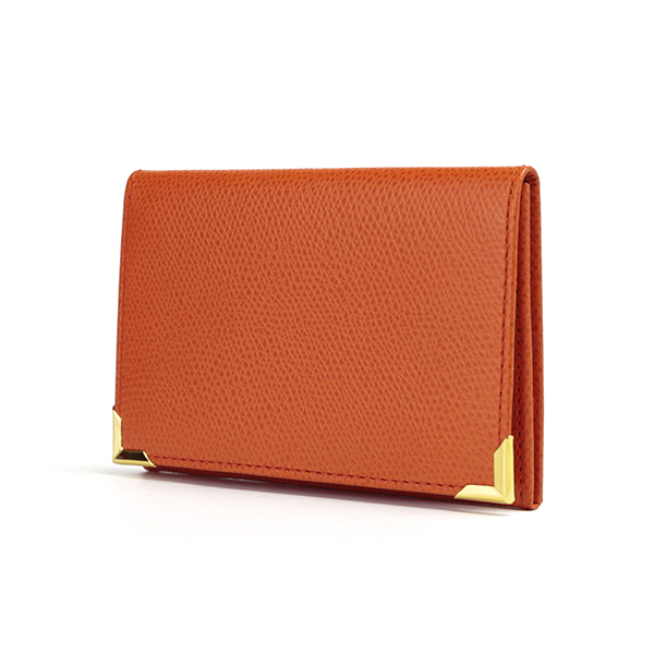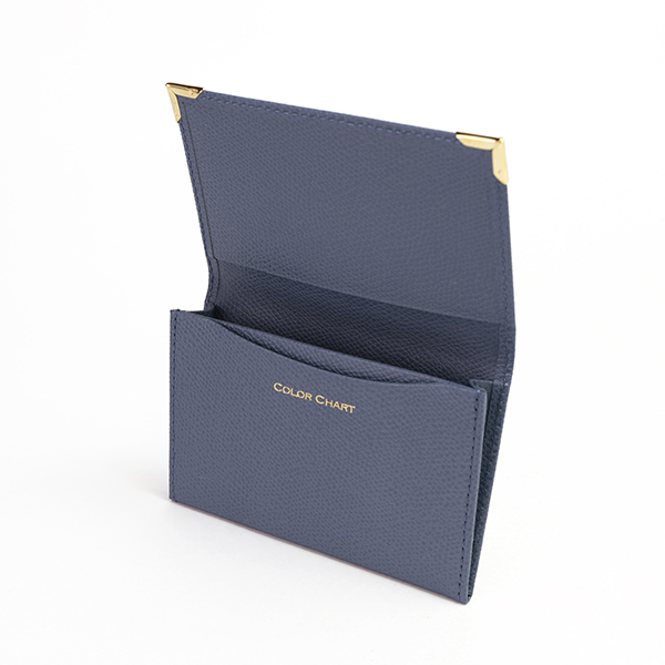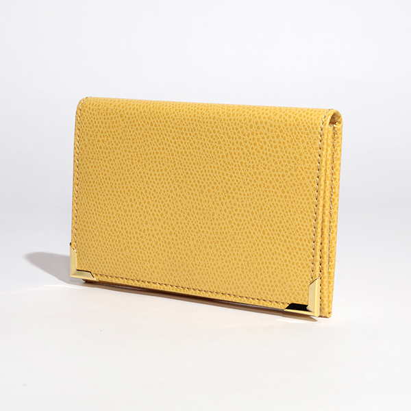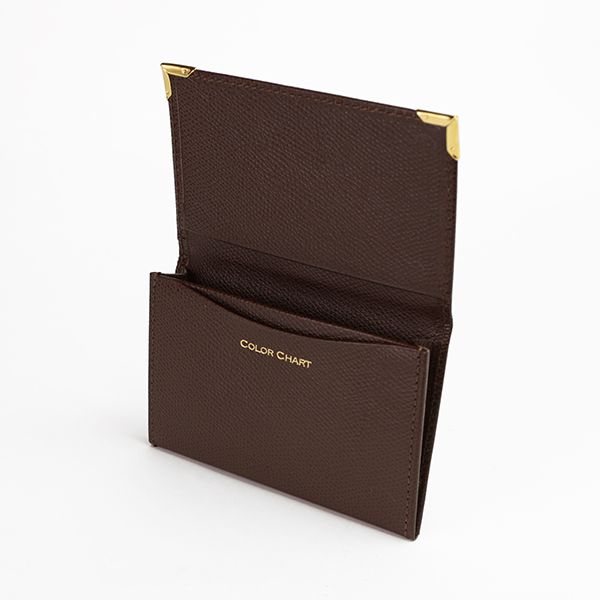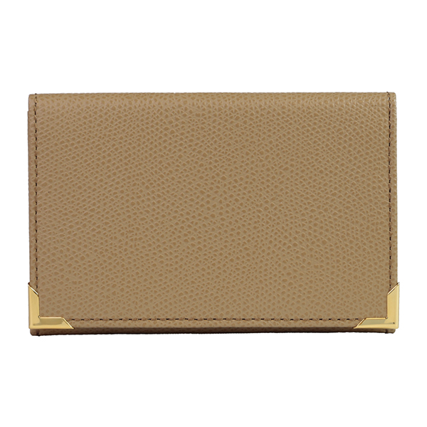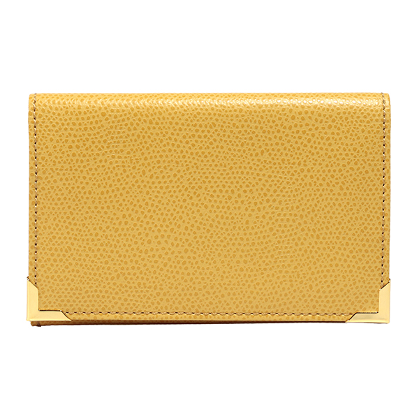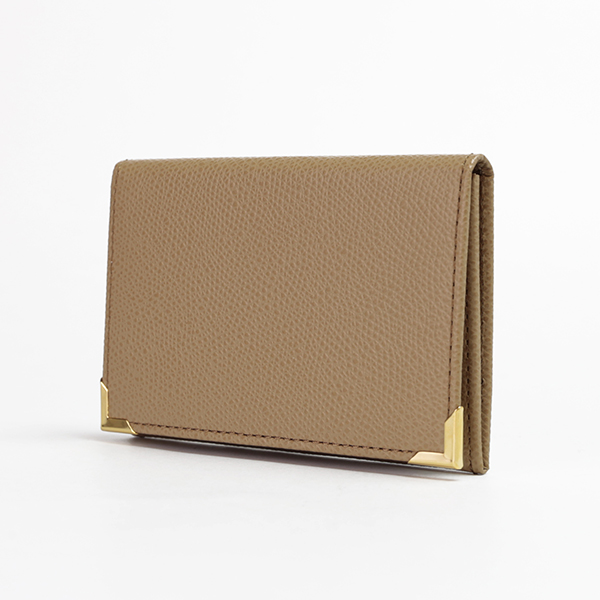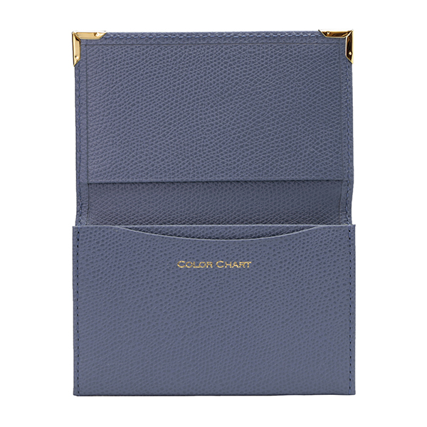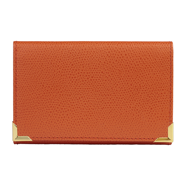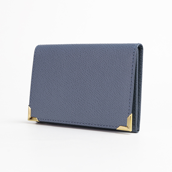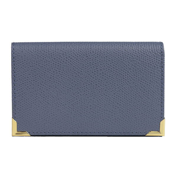 名刺入れといえばこのカタチ、と言える、フラップタイプの名刺入れです。すっきり仕立てられたフォルムにゴールドのアクセントが配され、スタンダードながら上質な印象です。