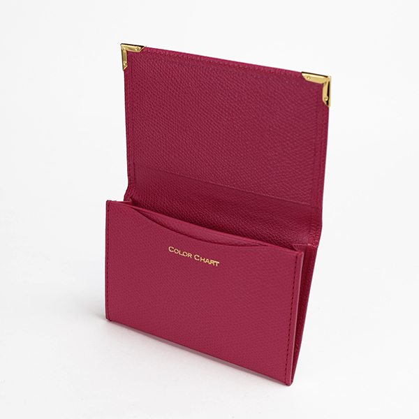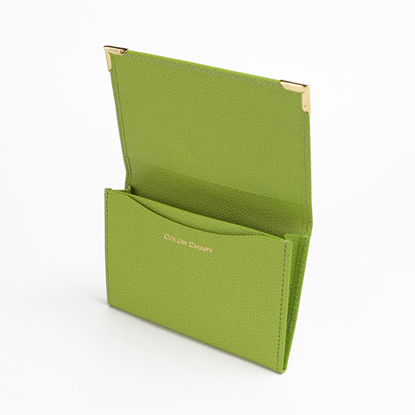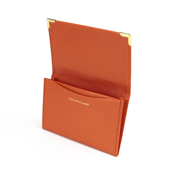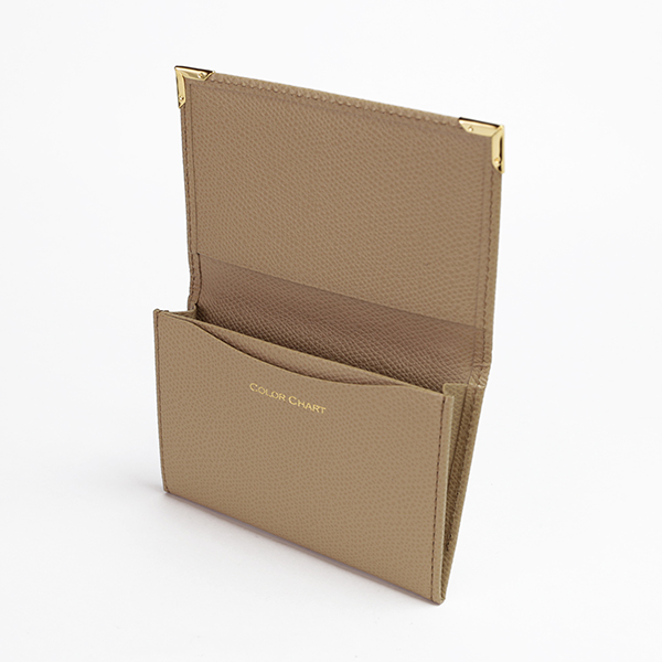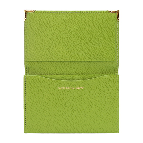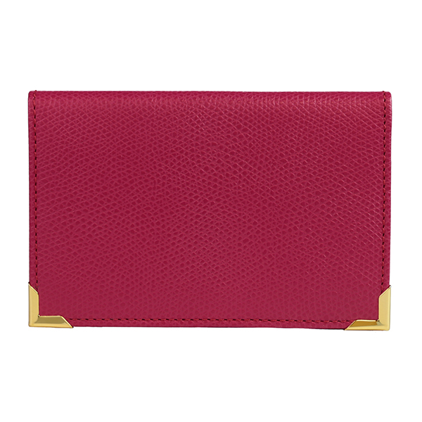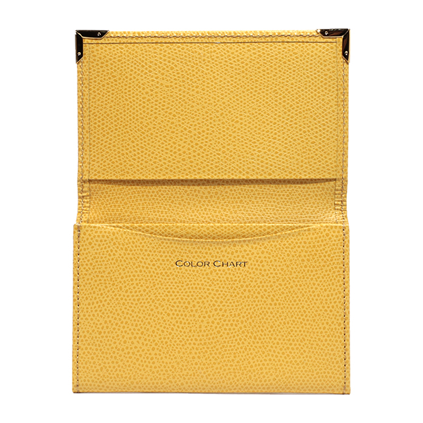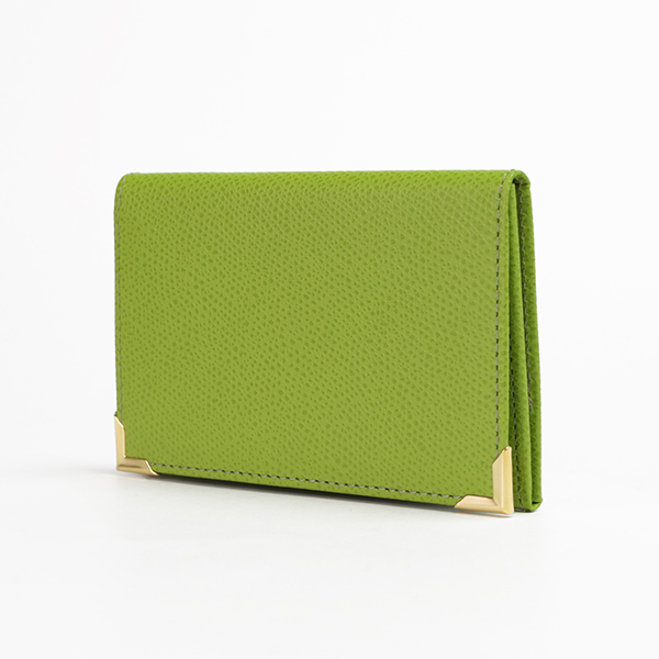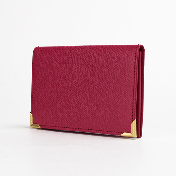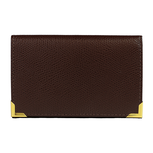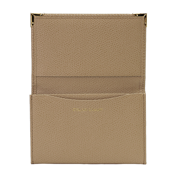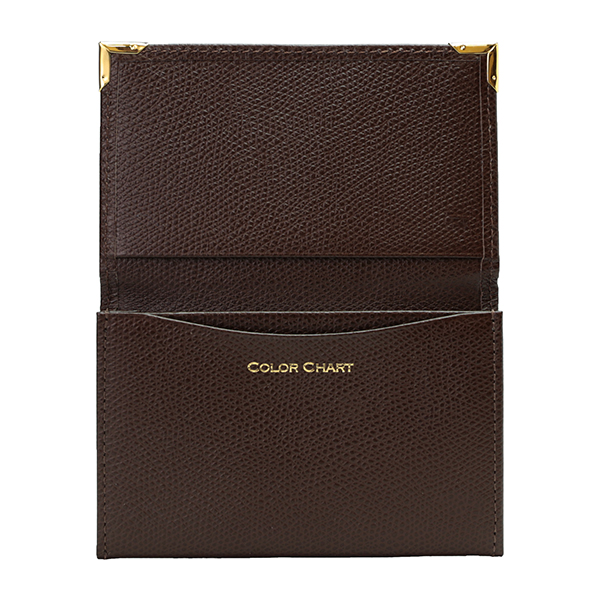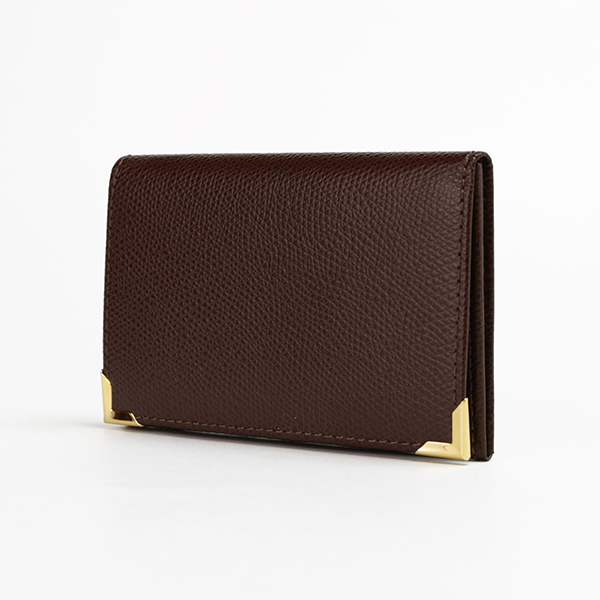 名刺入れといえばこのカタチ、と言える、フラップタイプの名刺入れです。すっきり仕立てられたフォルムにゴールドのアクセントが配され、スタンダードながら上質な印象です。